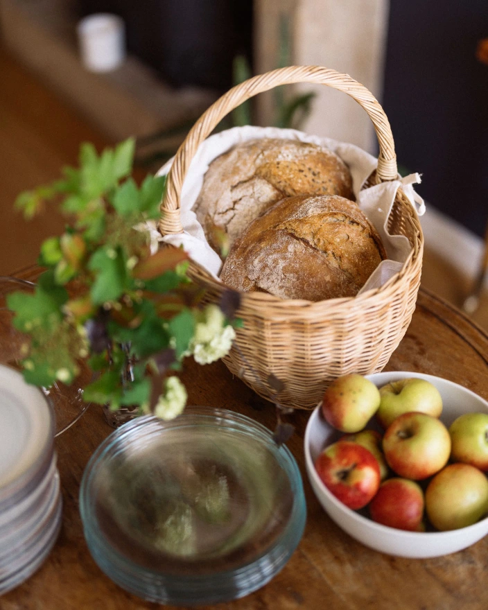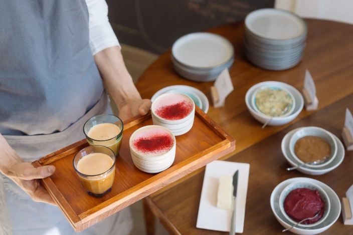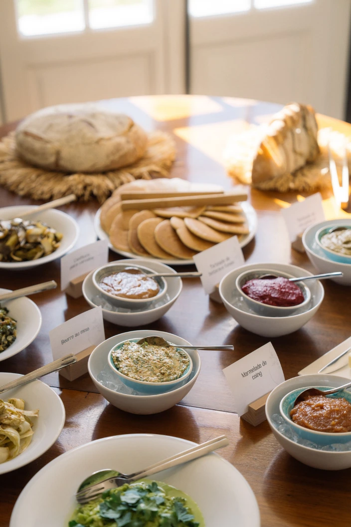 Les compositions végétales varient mais une base gourmande reste présente et se compose de : pain au levain, confitures des jardins, beurre du Sapalet nature et assaisonné façon Chivrageon, fruits de saisons, soupe chaude ou glacée selon le ciel, œufs brouillés au bain-marie, houmous de soja et tartinade du moment.