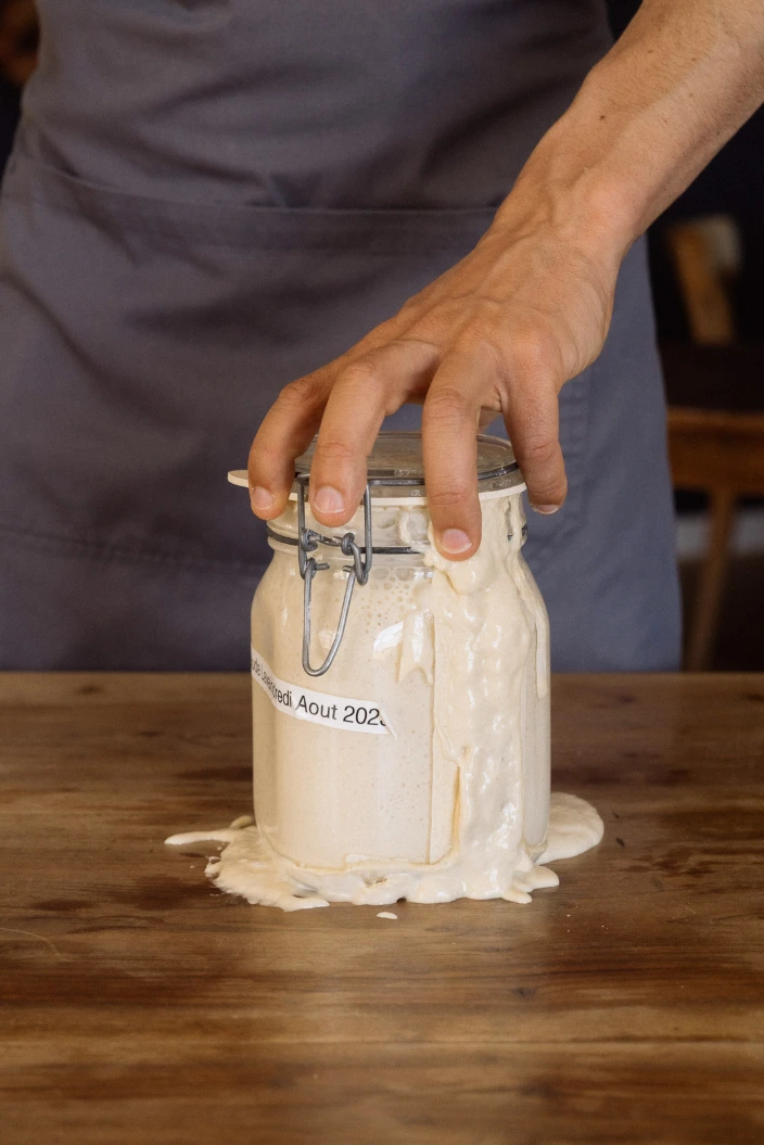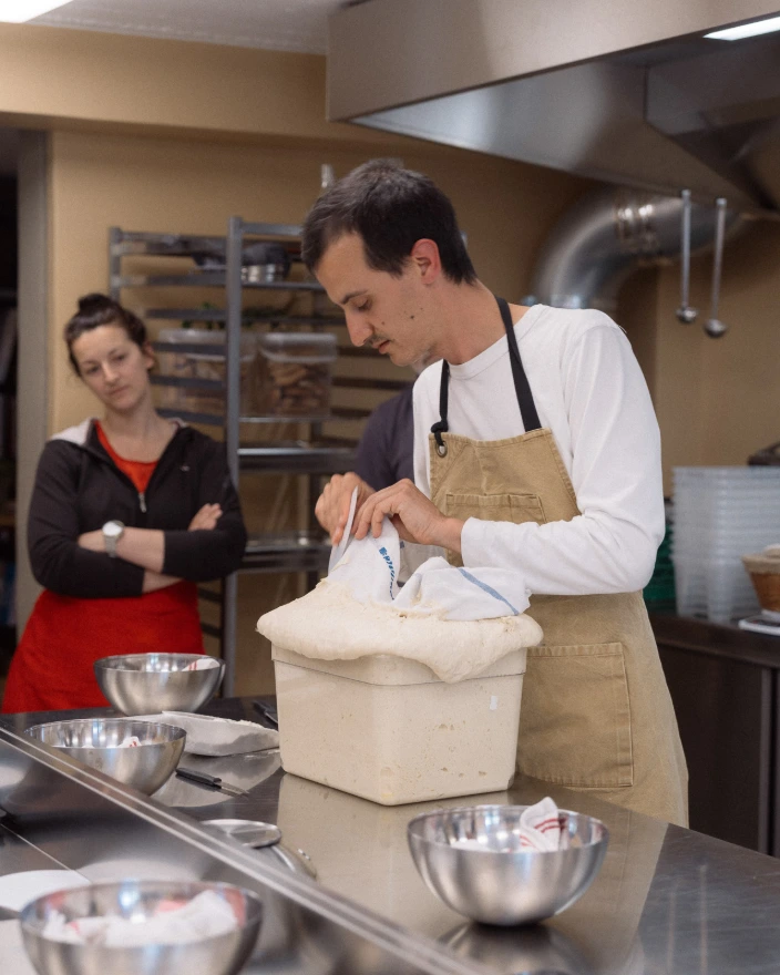 Raphaël, cuisiner-maraîcher, passionné de fermentation depuis son plus jeune âge, a toujours fait son propre pain au levain et a transmis son savoir faire dans différents restaurants. Il a, entre autres, été formé par Marc Haller, boulanger à Yverdon – une référence dans le domaine du pain au levain.